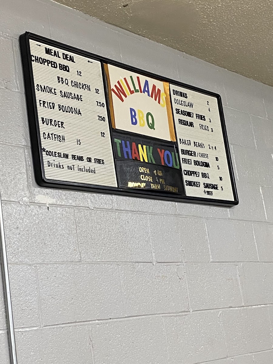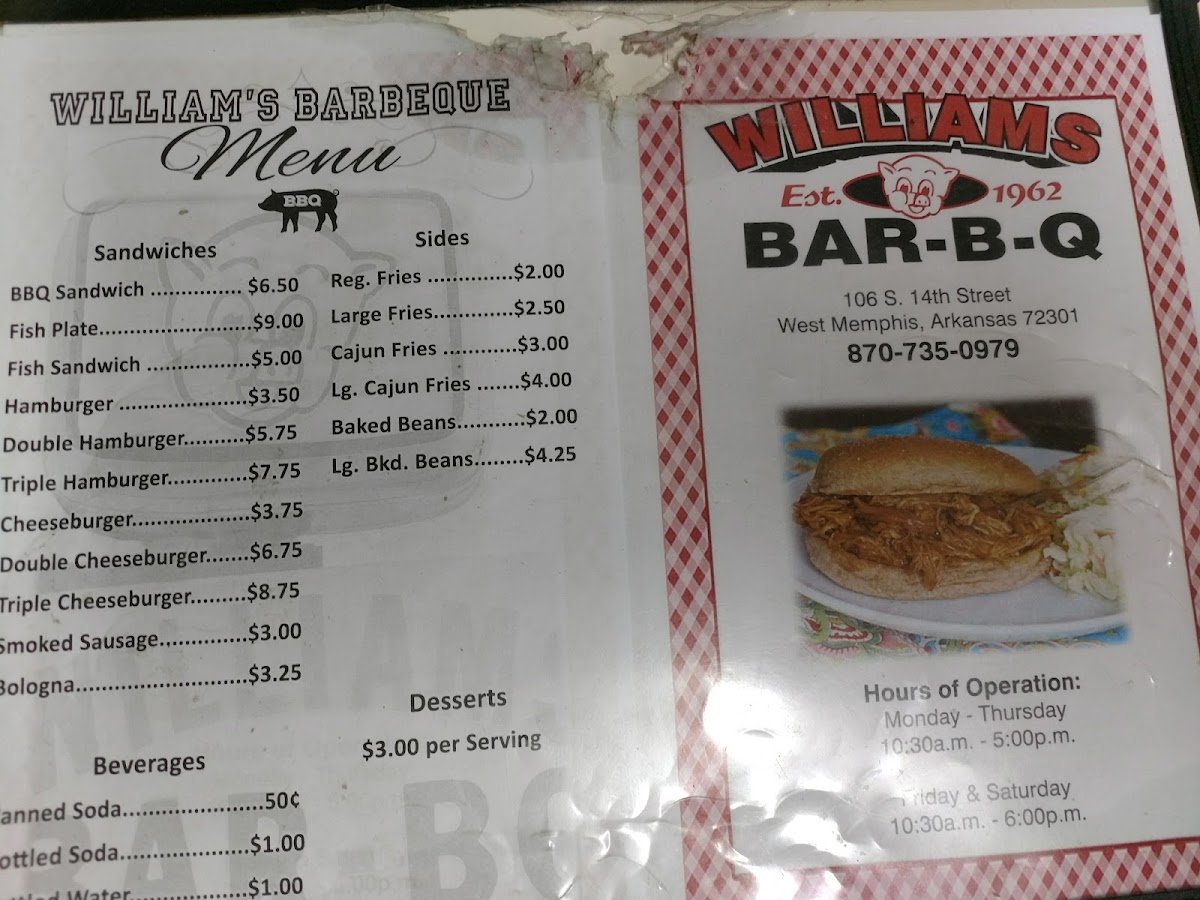 Welcome to William's Bar-B-Q, a cherished institution in West Memphis, AR, where barbecue lovers have come for over 55 years. Located at 106 S 14th St, this charming spot offers a range of mouth-watering options, including their renowned BBQ Sandwiches, juicy hamburgers, and smoked sausage. The menu extends to hearty sides like flavorful baked beans and crispy fries, ensuring that every meal is satisfying.